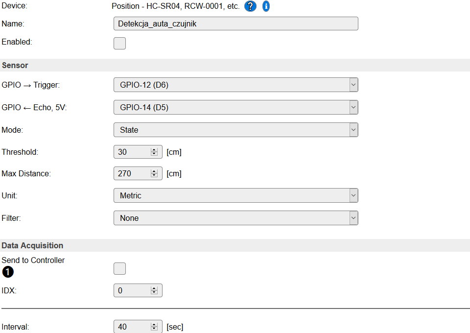 1. Detekcja_auta_czujnik - Nazwa jaką nadaliśmy urządzeniu z podłączonym czujnikiem odległości (wpisujemy własną)