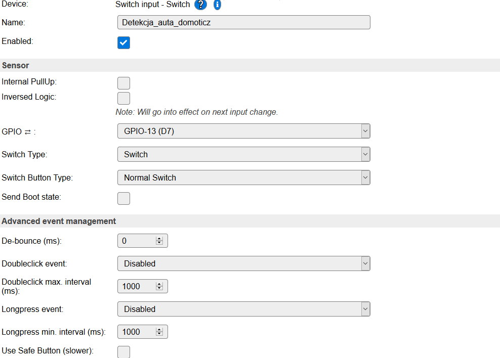 Switch input - Switch, całość konfigurujemy jak na zdjęciu poniżej. Ważne aby wybrać wolne GPIO nie używane